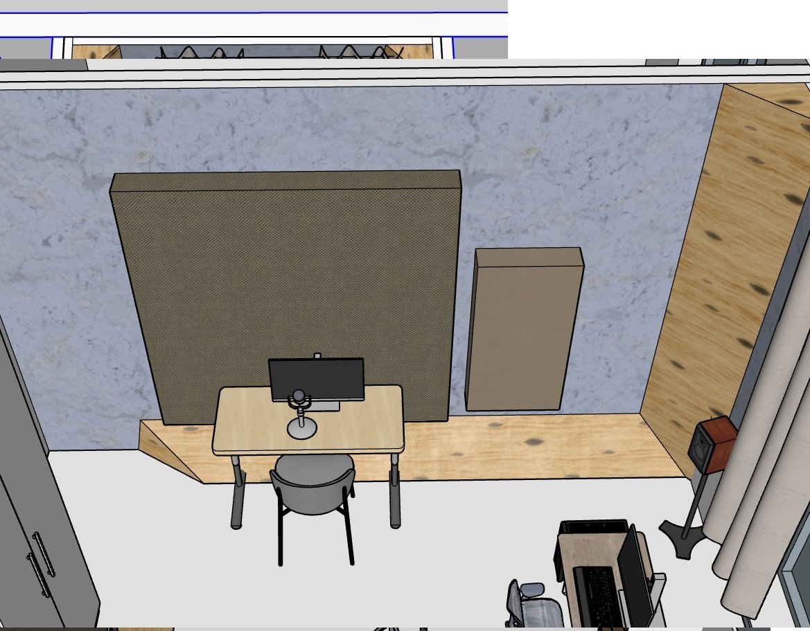 Стол с микрофоном - по длинной стене от двери. Стена у микрофона зашивается большой широкополосной панелью: относ от стены 50 мм, потом минвата 50мм и фибролитовая панель Heradesign. Над столом облако из минваты 150 мм. Соединение пол-слена закрыто треугольниками из минваты. Напротив кровать-трансформер, которая в сложенном состоянии представляет собой шкаф габаритами 1500х400х2200.