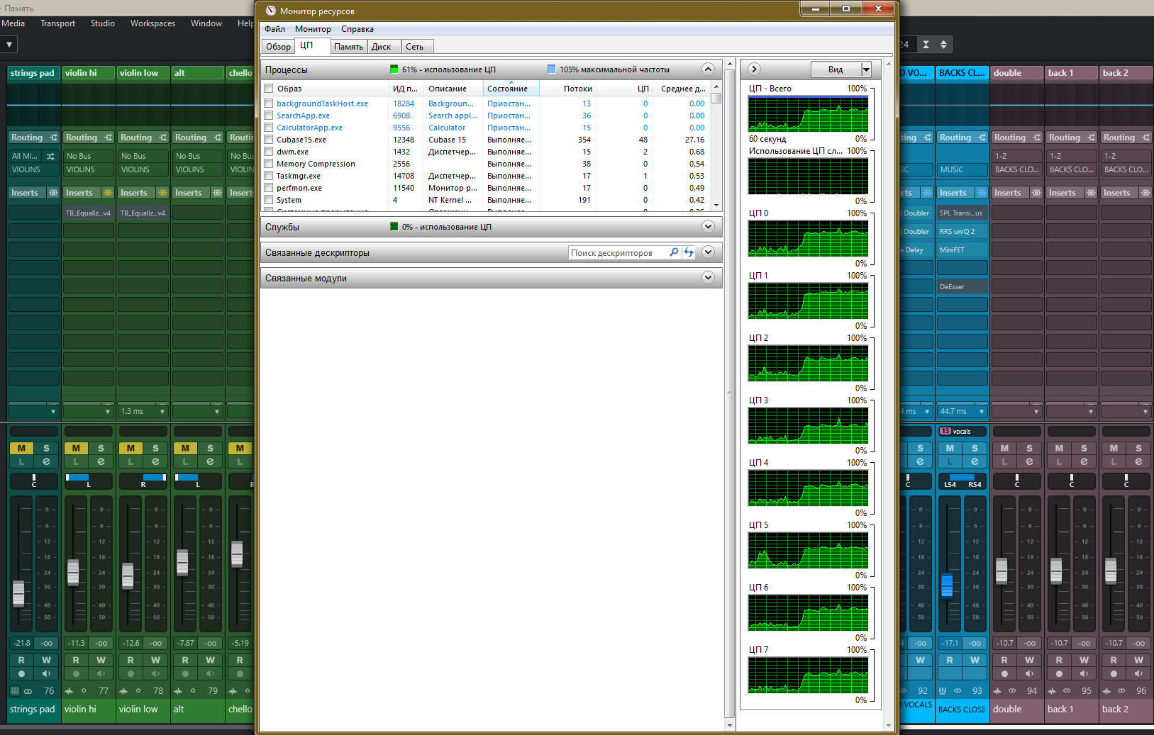 ПС: ЦП на каждое ядро можно и в диспетчере раскрыть/посмотреть, достаточно нажать там в настройках "время ядра" а не общую нагрузку. Проц кстати тоже на пределе. Но я всё же бы попробовал нормальный аудио интерфейс, с нормальным асио, а не асио АЛ.