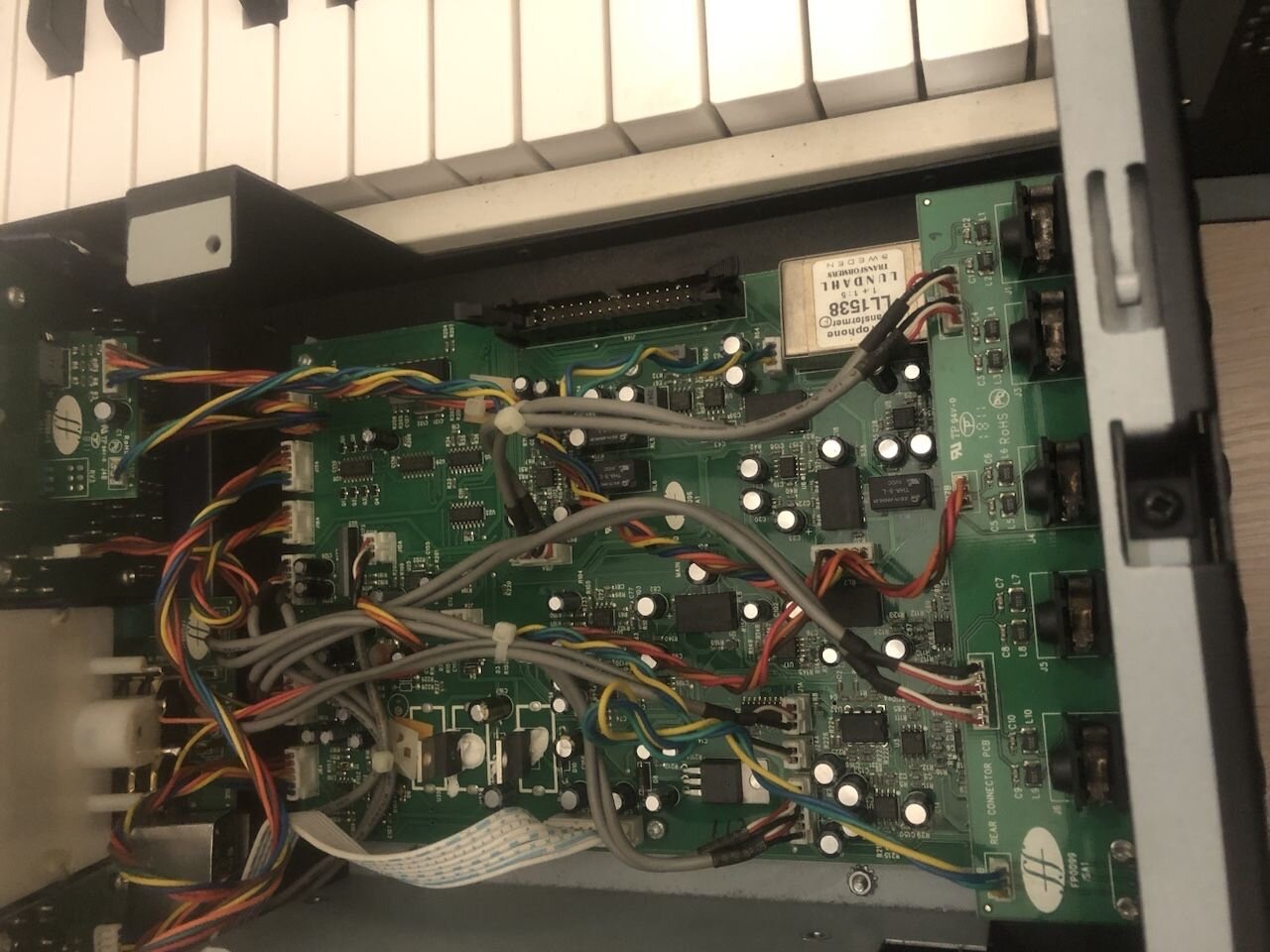 Не плохо в целом, куча плёнки и эл.литов )) Транс при желании можно разобрать. При снятии обечайки уже станет понятна конструкция - если транс с зазором, то верхний (по вашему фото) замыкающий блок пластин должен механически отделяться от основного "Ш"-магнитопровода в виде отдельного бруска, а в зазоре должен быть проложен диэлектрик (лавсан, электрокартон и пр.)
