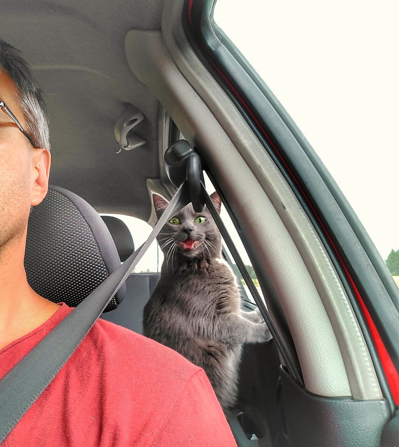 Пришлось везти зверя в другой город. После ловли по квартире и выковыривании из-под ванны, засунуть кошку в переноску уже не смог, поэтому пустил в салон так. Сфоткал, как она в ужасе пытается что-то сказать)