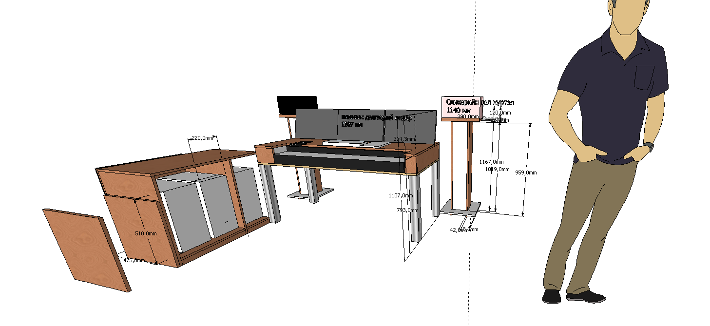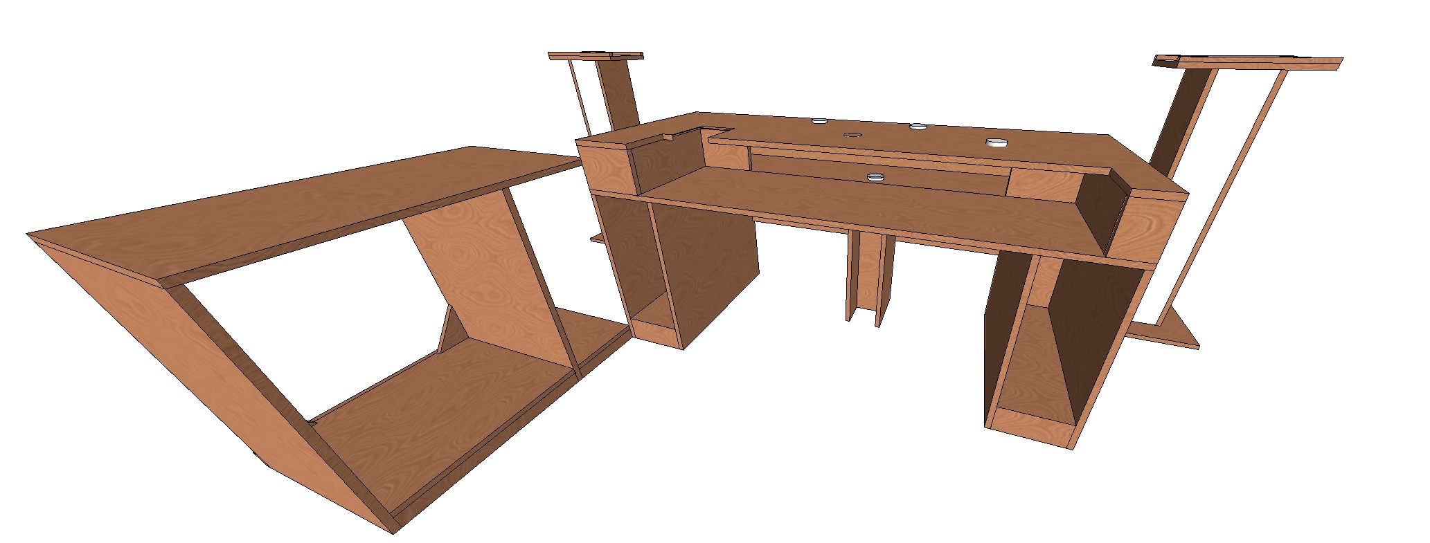 Вот здесь много чертежей. Может вам пригодиться. . https://3dwarehouse.sketchup.com/search/?backendClass=entity&q=Studio desk Устанавливаете скетч ап, скачивайте чертежи. Под свой нужды доделывайте. Программа бесплатная. 3D warehouse - е много чего можно найти. Многие клавиатуры и контроллеры спикеры там есть чтобы максимально точно представить будущий стол.