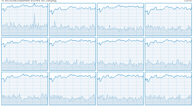 такое еще бывает когда тасками настолько все неорганизованно засрано, что постоянно гоняется оперативка туда-обратно, а процесс это не быстрый, и все это время проц ждет, но "занят"