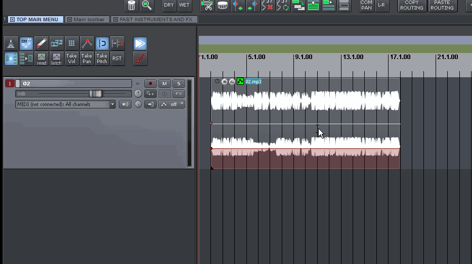 Зачем это - у меня с нажатой клавишей Alt при ЛКМ по нижней части айтема он разрезается под курсором мышки. Это меня устраивает, НО только если по вертикали один трек, а вот если нужно разрЕзать одновременно несколько треков, очень бы пригодился "прицел" перед тем как резать - чтобы сразу было видно в каком месте будет разрез на разных треках. Editing guide line для этого очень бы подошёл, но вот как его заставить появиться в такой ситуации?