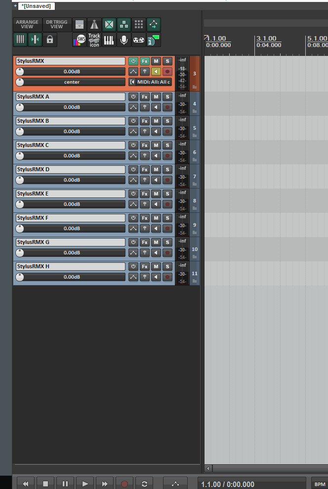Если вы добавляете виртуальный инструмент StylusRMX через функцию Insert virtual instrument on new track... + multichannel routing, то у вас выходы с дорожки StylusRMX направляются на индивидуальные выходы (StylusRMX B...-...H).