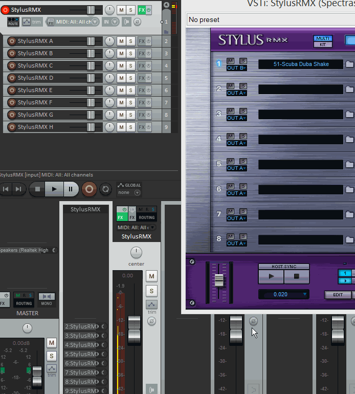 @SuperDroid, потому-что это дефолтный канал инструмента, он работает всегда в инструменте на него приходят все ауксы и канал А (поэтому master send автоматом отключается, при создании мультивыходной конфигурацииинструмента, чтобы не дублироваться). Если не создавать папку самим инструментом и включить master send на самом инструменте вы получите дубль канала А. По сути, Стилус отдаёт все выходы на DAW, канал А дублируется в самом Стилусе. Входов у него нет. А вы пытаетесь из DAW завести сигнал в Стилус обратно.