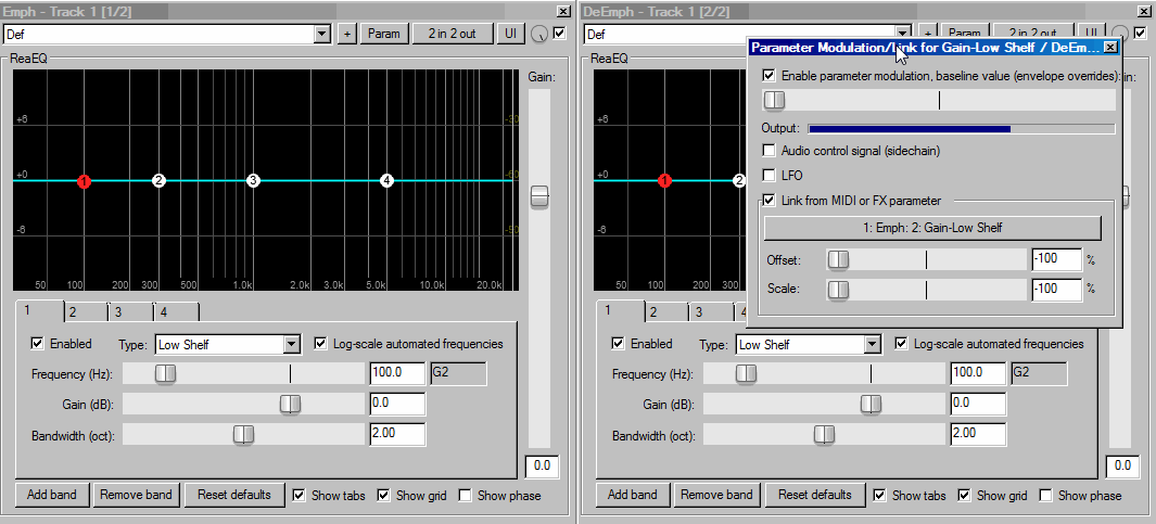 Вы шутите или серьёзно? :) Если на ReaEQ это неосуществимо, то тогда мне просто нужен JS эквалайзер с двумя полками, в которых одинаковый гейн в плюс и минус, с изменяемым Q и среднечастотный bell, также с изменяемым Q. Вот и всё, а переделывать для меня ничего не нужно :)