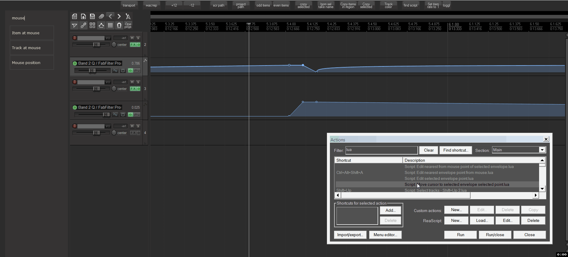 @Aleksandr Oleynik, Да в том то и дело, что не хотелось чтобы курсор всю дорогу за мышкой бегал. Можно конечно и так, но по сути вся затея чтобы вызвать свойства поинта горячей клавишей. А оно привязано к Envelope: Edit envelope point value at cursor. Если есть способ вызвать окно значения без этого, то сразу будет здорово.