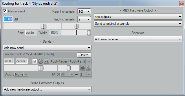 Стилус дружит с RMX. Маршрутизация не хитрая, если смогли разобраться с маршрутизацией в Kontakt, то у Вас получится. Принципы те же самые - где надо посылать миди - посылаем на Стилус миди по одному из 8 каналов, аудио не посылаем, для аудио дорожек - наоборот. То есть в полном варианте надо иметь 8 миди дорожек и 8 аудио дорожек (если хотим каждый трек обрабатывать внешними плагинами). Вот так выглядит миди маршрутизация со второй дорожки, остальные можно настроить аналогично.А Рипер дружит со Стилус РМХ?