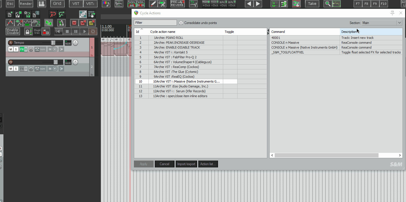 да я уже изучил самую основную базу в видео, немного экшены, свои простейшие экшены делал. Теперь когда есть различные обучающие видео и интернет, обучение идет быстро, не то что 12 лет назад когда я в сонаре методом тыка все изучал. Правда 10 лет назад все это и оставил, вот вернулся пару месяцев назад, изучил полностью фрукты, написал несколько треков и понял что фрукты меня бесят и мне нужен линейный секвенсор, т.к. дело привычки , хоть и 10летней давности. В програмировании полный 0 и мне не нравится оно :), не хотелось бы , если честно так глубоко копать поэтому. Вот и хотел убить сразу всех зайцев скопировав части от чужих конфигураций.