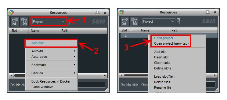 Далее открываешь Action list, там ищешь экшн SWS/S&M: Resources - Open project, slot X (где Х - номер слота с нужным проектом) или SWS/S&M: Resources - Open project, slot Х (new tab) - открыть в новой вкладке. И назначаешь этот экшн на кнопку.