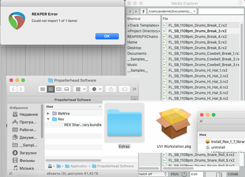 Привет. Перестали работать файлы REX в Reaper , видимо я что-то сломал. Пробовал обнулить Reaper, не помогает. Видимо что-то в самой MacOS нахимичил.