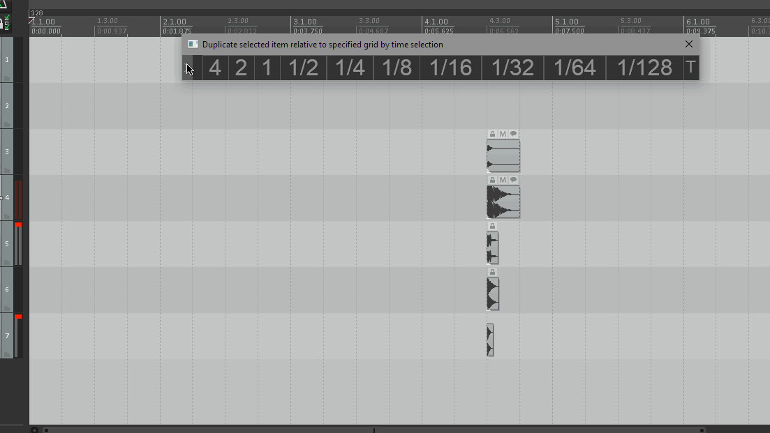 @Archchie, А возможно ли сделать -Smart duplicate items grid relative по тайм селекшн?Кстати в этом примере копирование практичней,но приходиться растягивать куски аудио,до нужных величин.В лучшем варианте: если бы появлялось меню,как в Nudge set(1/2, 1/4, 1/8 и т.д)выбрал нужное,выделил time selections применил экшн.