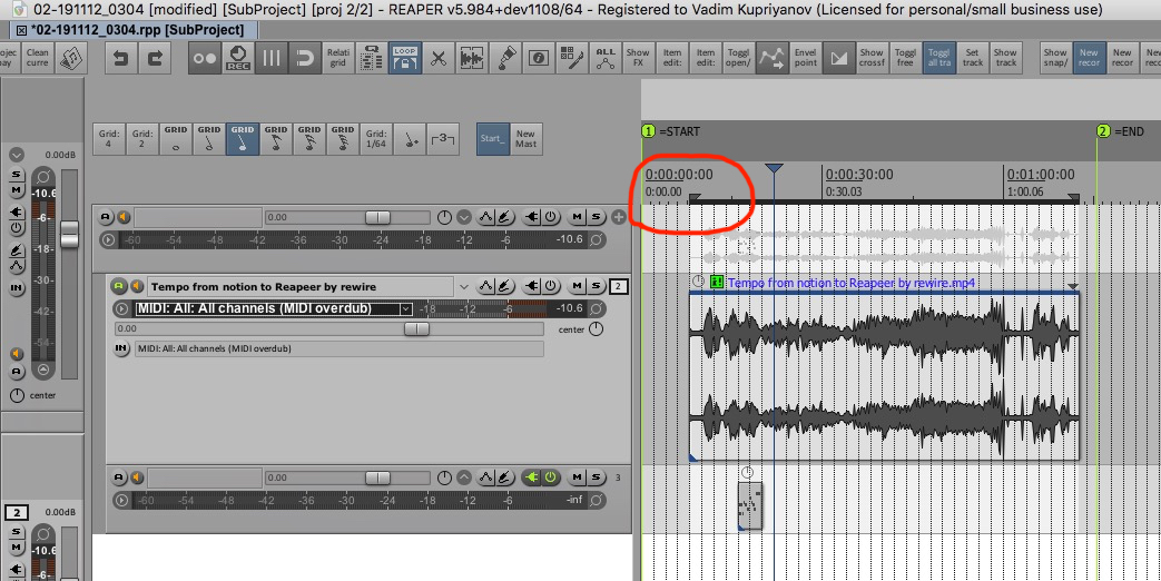 пока с сеткой куча вопросов навалилось. надо будет погуглить. Например, видео стоит в мастер-проекте на таймкоде 0. А субпроект у нас - минутный кусочек из середины. Выдернули мы этот кусок из середины. А в субпроекте для нас актуальнее грид не по минутам/секудам, а по тактам/долям. и вот, наша сетка в режиме такты/доли стоит относительно видео не там, где нам хотелось бы. И вот кого из них можно безболезненно сдвинуть, чтобы потом результат не разъехался с видео в мастер-проекте - вот это ещё предстоит выяснить.