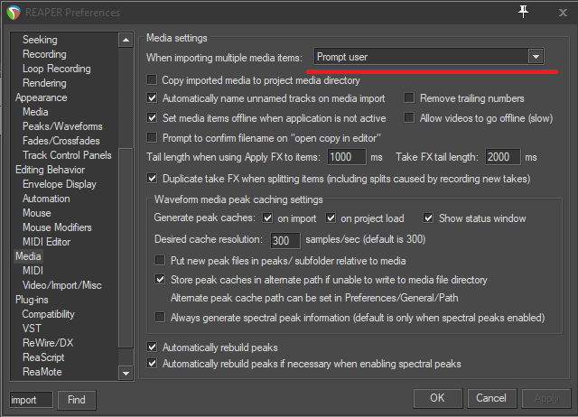 Вопрос по импорту медиа. Установил import files as - always promt, но рипер, почему-то не спрашивает ничего при импорте медиа. Дело в том, что когда я обновился до 6 версии, мне надо было что-то быстро делать, я начал кидать лупы и рипер начал выдавать вопросы, как их встраивать, я ничего не понял, что-то нажал, очень спешил, и вопросы прекратились))) Теперь он даже при такой установке ничего не спрашивает. Как исправить?