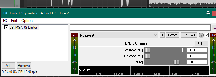 Вам надо в FX chain загрузить всего один плагин MGA JS Limiter, с такими настройками, как на скриншоте. Думаю, вы получите то, что хотели. Если сжатие будет слишком сильным, то уменьшите параметр Threshold (поэкспериментируйте с ним).