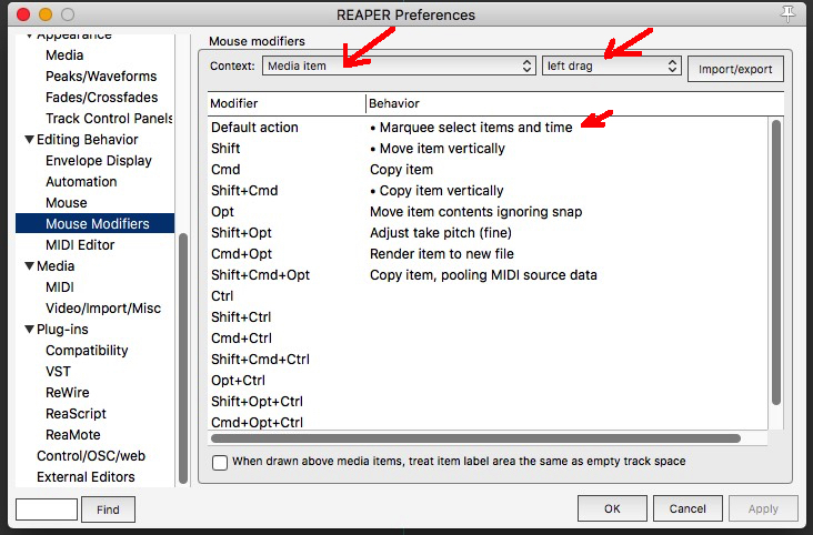 @Adriatic, Так вы напишите точно и конкретно что вам надо. Например - курсор над айтемом, зажимаю Shift, тяну вправо и хочу чтобы выделялась область Time Selection и вместе с ней айтемы. Скорее всего все найдете в mouse modifiers. И пишите всегда обычным шрифтом пожалуйста)