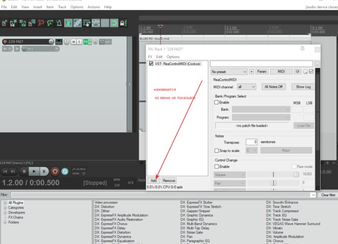 Здравствуйте) 1) На скрине пассивна кнопка Add (FX), но плагины вроде есть, т.к. внизу отражаются. 2): как вы боретесь с тем, что если открыть обучающий ролик на ютубе, то аудиокарта перехватывается им, и рипер пишет, что audio closed? Винда. Спасибо.