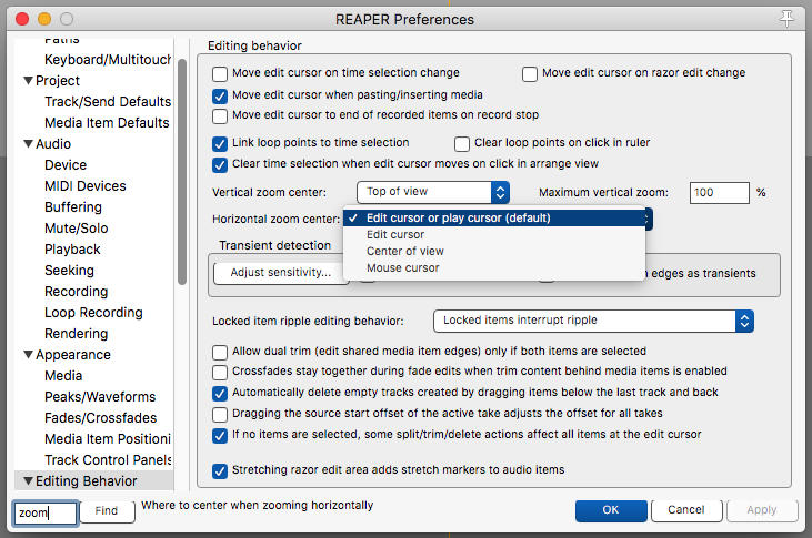 спасибо! попробую, сейчас не у компа, но похоже это варианты, в каком месте будет происходить центровка экрана при зуме, а мне бы её либо вообще отключить, либо сделать реверсивной, чтоб центровало ближе к максимальному зумированию. Ну как в основном это происходит в DAW
