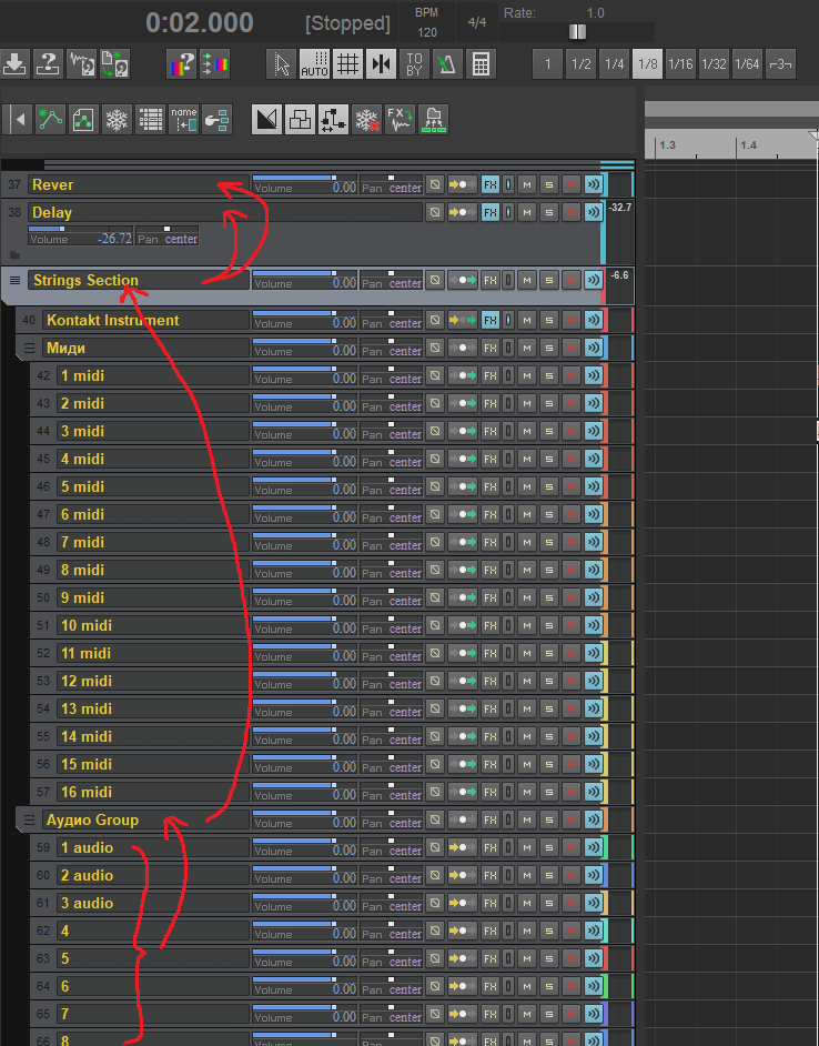 Мысль что может лучше с Аудио Group - делать сенд на эффекты, а с эффектов на дорожку Strings Section. а её на мастер. Чтобы меньше сендов на мастер, как с дорожек с эффектами, или это не играет роль?А где вас сомнения терзают?