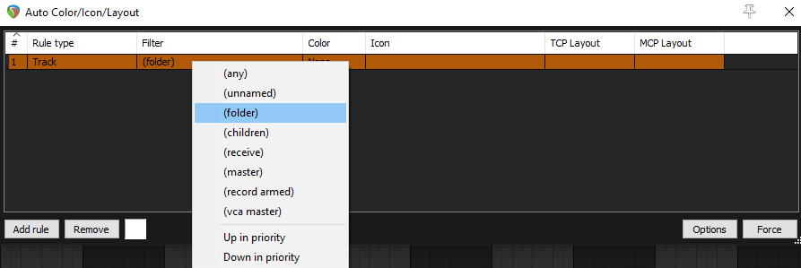 @Lowcut, может это вы не доступно объясняете? Что значит «настройки для всех состояний треков, а не что-то особенное именно для папок.» если на скриншоте правило именно что только для папок? Добавьте к этому ещё правила назначения цвета и иконки в зависимости от присутствия в названии определённых слов и будут ваши папки автоматом раскрашиваться. Если оставить только folder без дополнительных правил, будет применяться ко всем папкам по умолчанию.