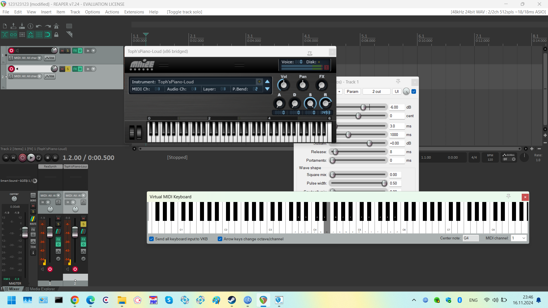 На ноутбуке установил чистый reaper, поставил vst tophs piano, включил на канале input - all midi inputs - all channels, нажимаю кнопку на клавиатуре (пробовал и внешнюю миди клаву и виртуальную), миди сигнал приходит, а звука нет. При этом проверил, что вст точно рабочий, и в нем и в пиано ролле есть звук.