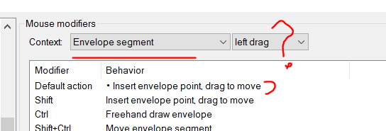 когда кликаю в путоты envelope lane, почему-то ставиться узел, а вmouse modifiers выбрано deselect all env points and move edit cursor..
