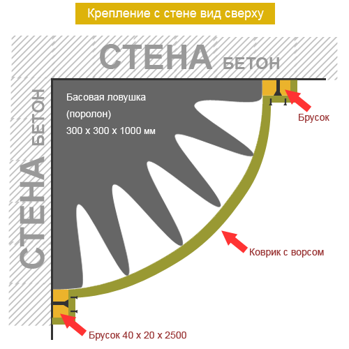 Конструкция это даже громко сказано :), вот набросал как делал. Бруски прикручивал к стене, они держали ловушки, к ним крепил саморезами коврики. С низу ловушки стояли брусках, т.е. пола не касались и воздух свободно проникал в пространства между вырезами в ловушках. Коврики были прижаты к ловушкам достаточно плотно и пола тоже не касались. Но и ловушки и коврик упирались в потолок. Потолок правда был натяжной. Была мысль ещё между потолком и стеной так сделать, но мне хватило и по углам. Я так понял что коврики работали как мембрана (они же вибрировали на модах) и эффект был за счёт того, что в ловушках именно эти вырезы, они и создавали разницу давления воздуха, примерно как в акустических резонаторах, может я и ошибаюсь конечно :).