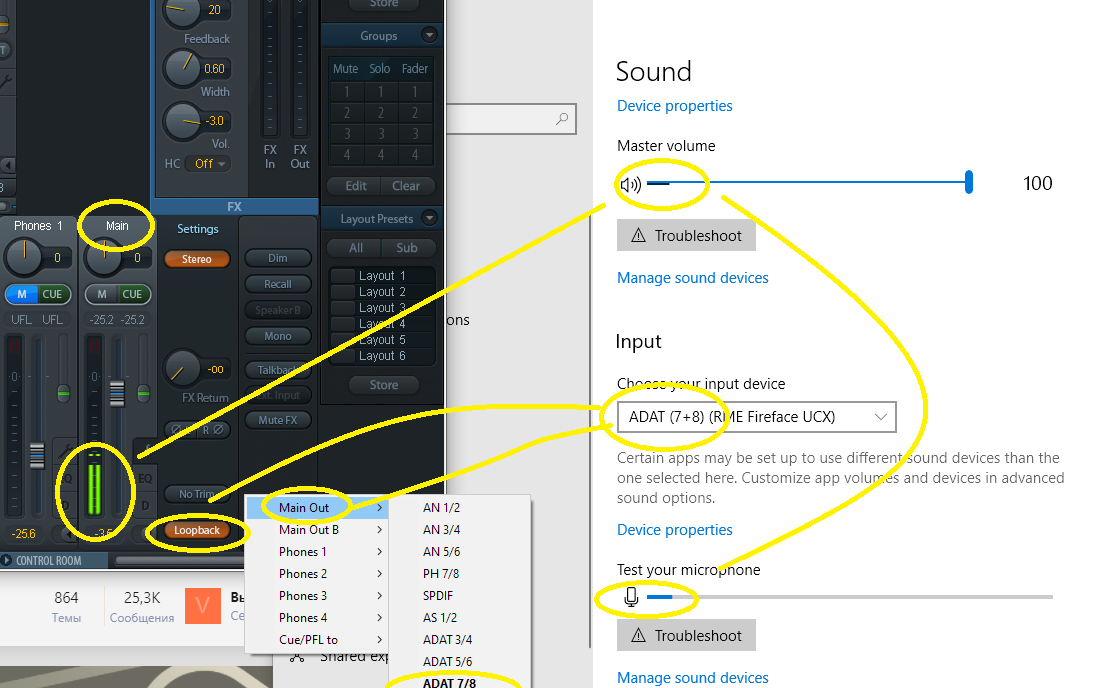 @Furqat, на выходе AN 1/2 включить loopback а устройством ввода назначить вход AN 1/2. На запись уйдет сигнал с мониторов.