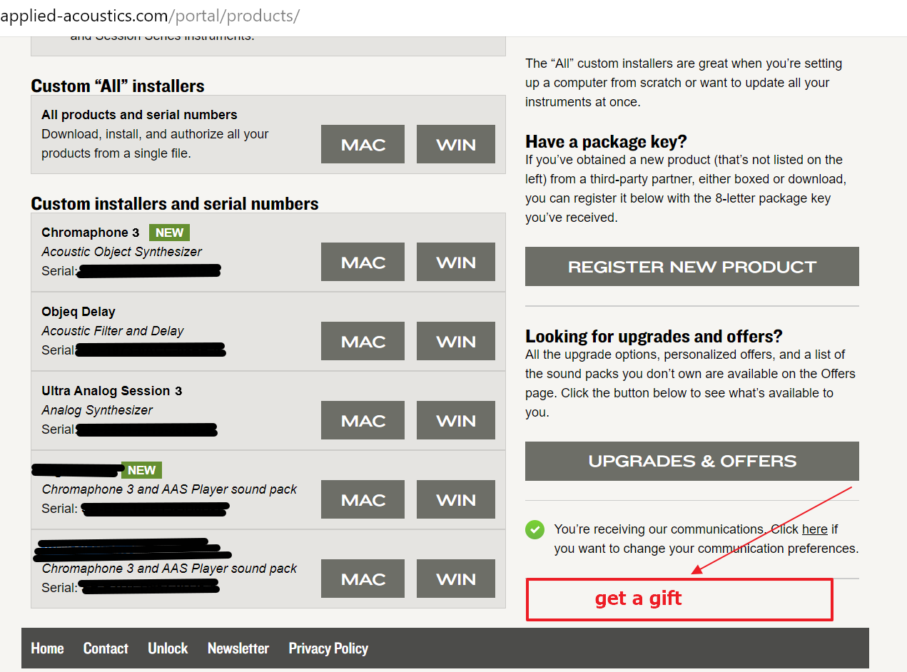 1) Зашел на свой эккаунт Applied Acoustics Systems и в вкладке Registered Products внизу обнаружил кнопку получить подарок) предлагают выбрать один из sound bank`ов. Может быть этот подарок связан с тем что приобрел Chromaphone или это независимая акция - посмотрите, может вам тоже есть подарок. Скриншот прилагаю.applied-acoustics gif.png