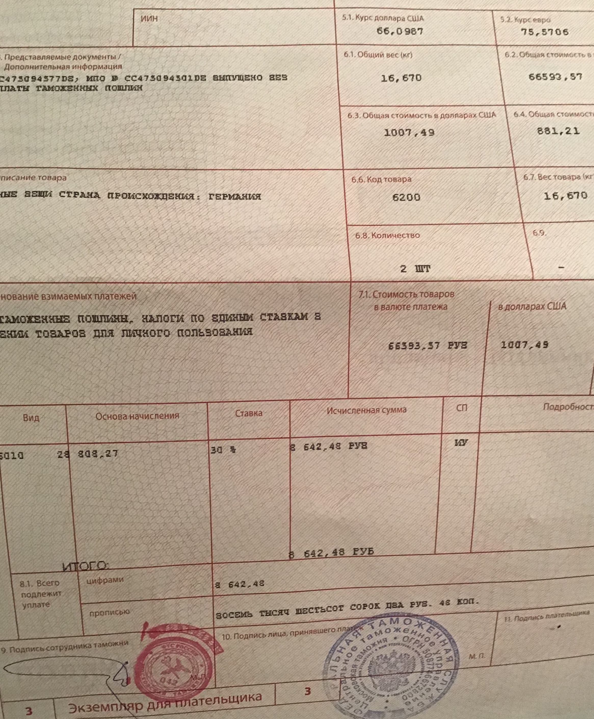 - таможня внезапно решает, что у меня две посылки на сумму 881€ и обязывает оплатить пошлину. В итоге на почте заплатил 9 005₽.