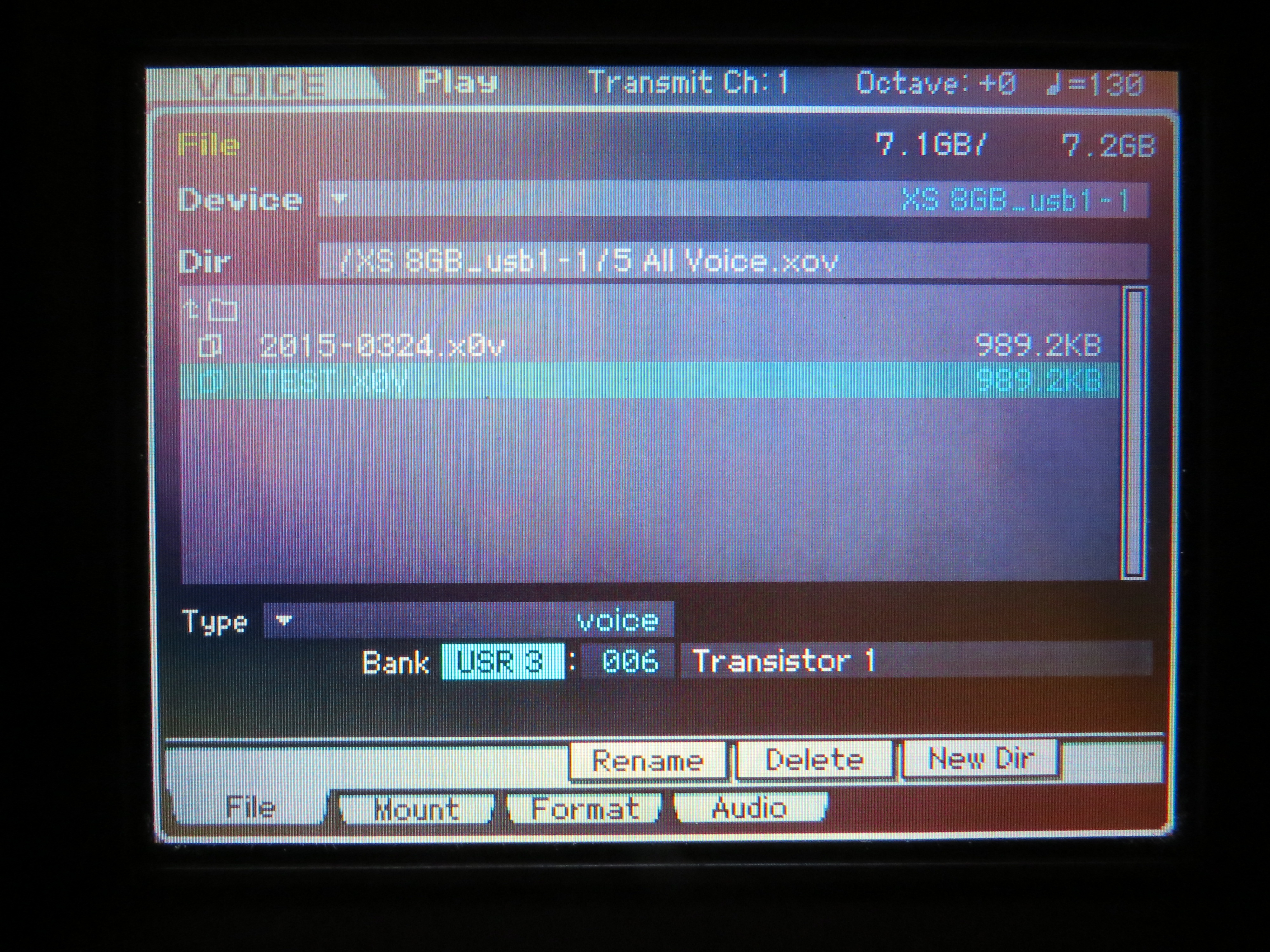 Сохранение созданного голоса - стр. 97 мануала. Сохранение файлов - стр. 278. Процедура сохранения зависит от типа сохраняемого файла и режима, в котором находится синтезатор, перед выбором меню File. Чтобы сохранить Ваш созданный Voice - после создания его нужно сохранить в синте - Store, затем, находясь в режиме Voice - перейти в меню File - выбрать тип сохраняемого файла All Voice - появится команда Save - сохранить. Чтобы затем его загрузить в синт - находясь в режиме Voice - выбрать меню File - тип Voice (.XOA .XOV) - выбрать Ваш Voice из списка, указать место, куда он будет загружен и выбрать Load. Загруженный Vioce перезапишет ранее находившийся в месте, которое Вы указали.