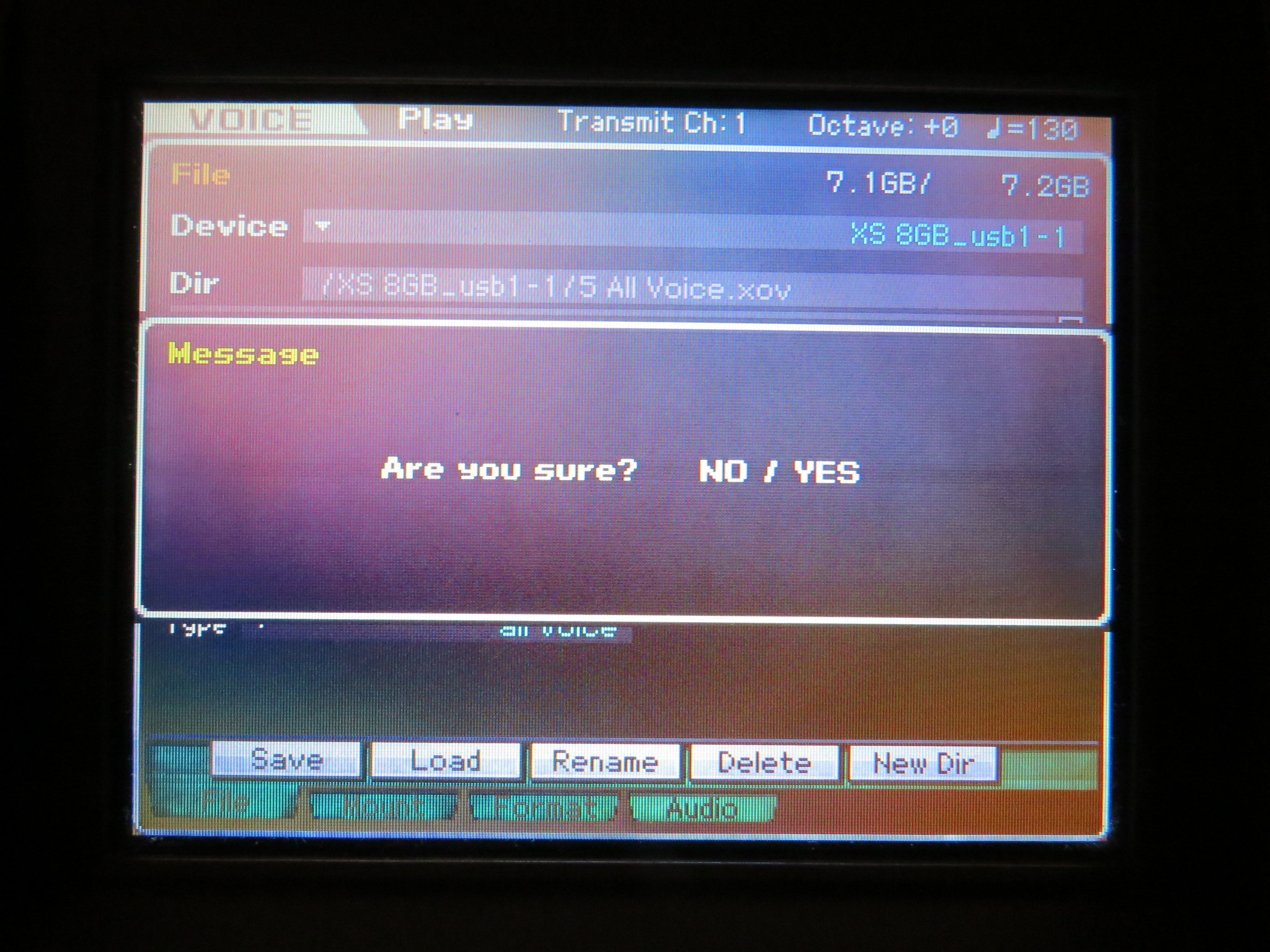 При выборе All voice > Load появляется меню "Are you sure? NO/YES" после чего, если нажать Yes перезаписываются все голоса.