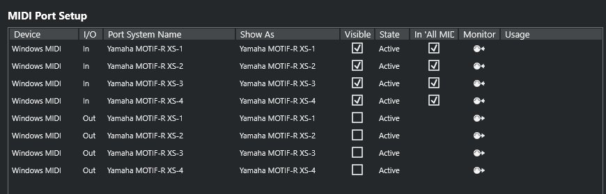 всегда цеплял мотиф ес рек (думаю не велика разница с xs) на первый usb миди порт и все норм и в дав и студио менеджере. остальные отключал, в винде: xp, w7, w10. потом перевел его на миди порты, и мне даже больше понравилось.