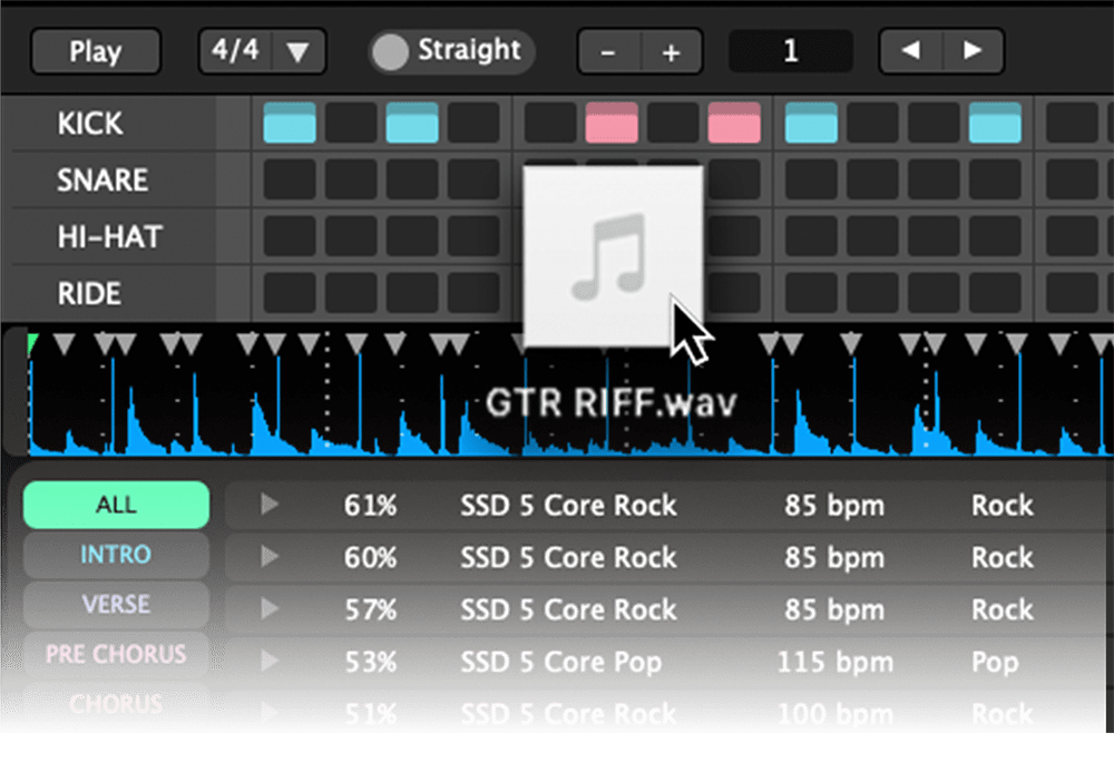 Groove AI — это новая функция SSD, которая анализирует ваш бит, рифф, басовую партию или другой фрагмент песни и за секунды выбирает наиболее подходящие грувы из тысяч грувов SSD.