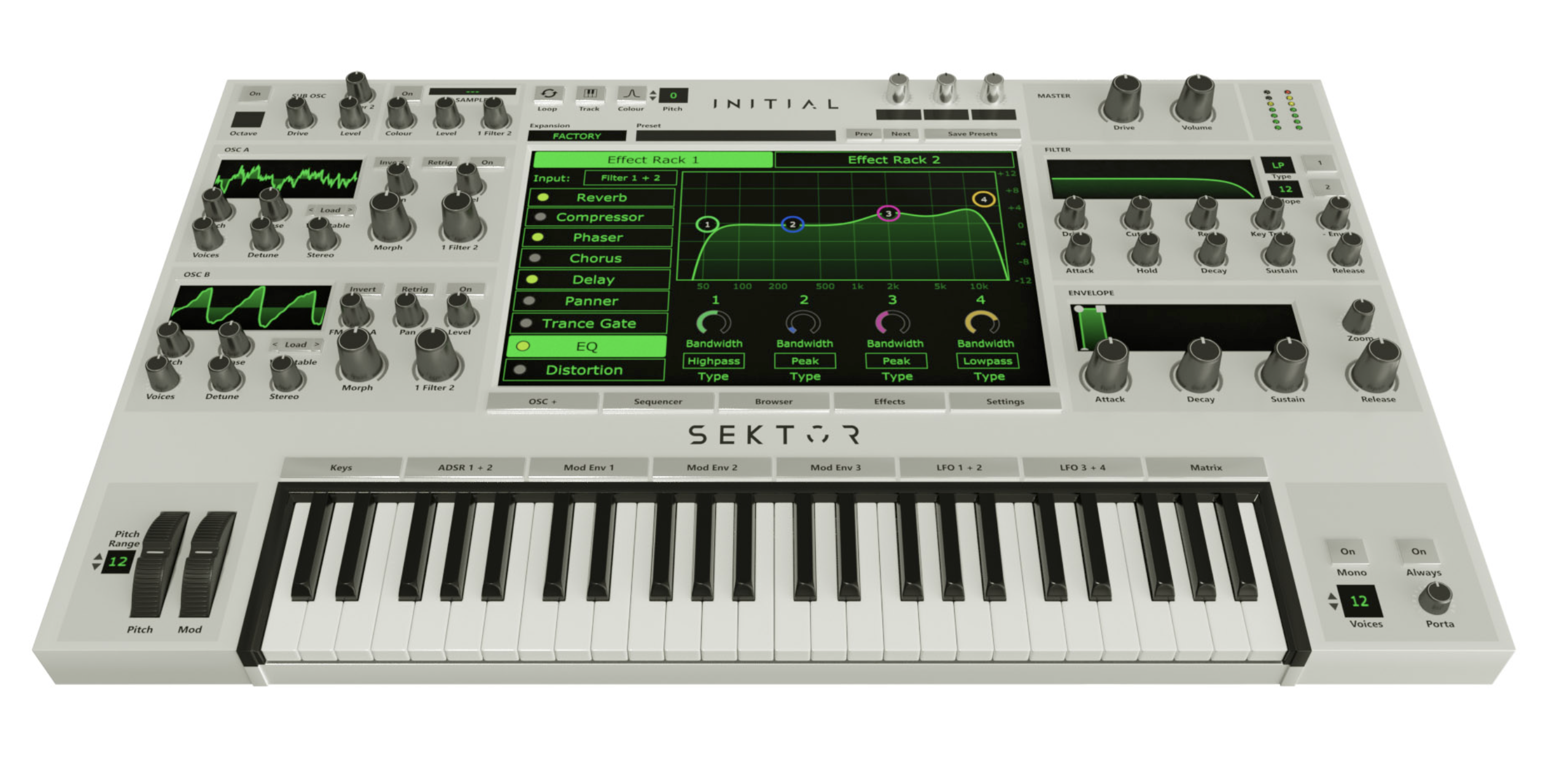 Sektor also comes with two effect racks including effects such as reverb, delay, distortion, chorus, phaser, trance gate, compressor, stereo shaper and a 4 band equalizer.