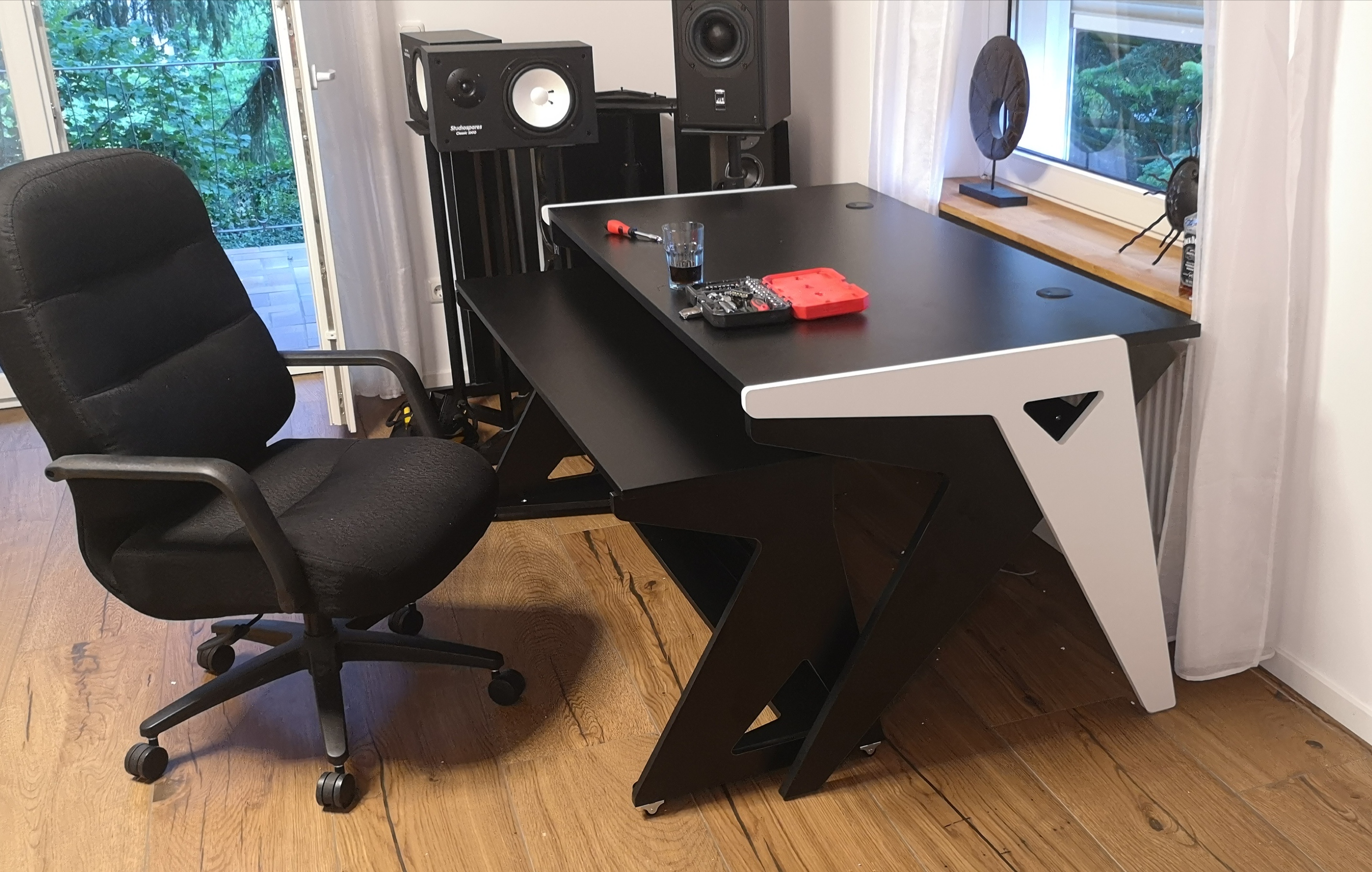ну оч дешево, пришлось немного допиливать напильников), регулировка по высоте(наклон) не оч, но цена-качество-"грузоподьемность" -20 кг,.. сначала испугало-подзванивали, но под нагрузкой с прокладкой - нормально, ничего не звенит. Разгрузил площадь на столе.