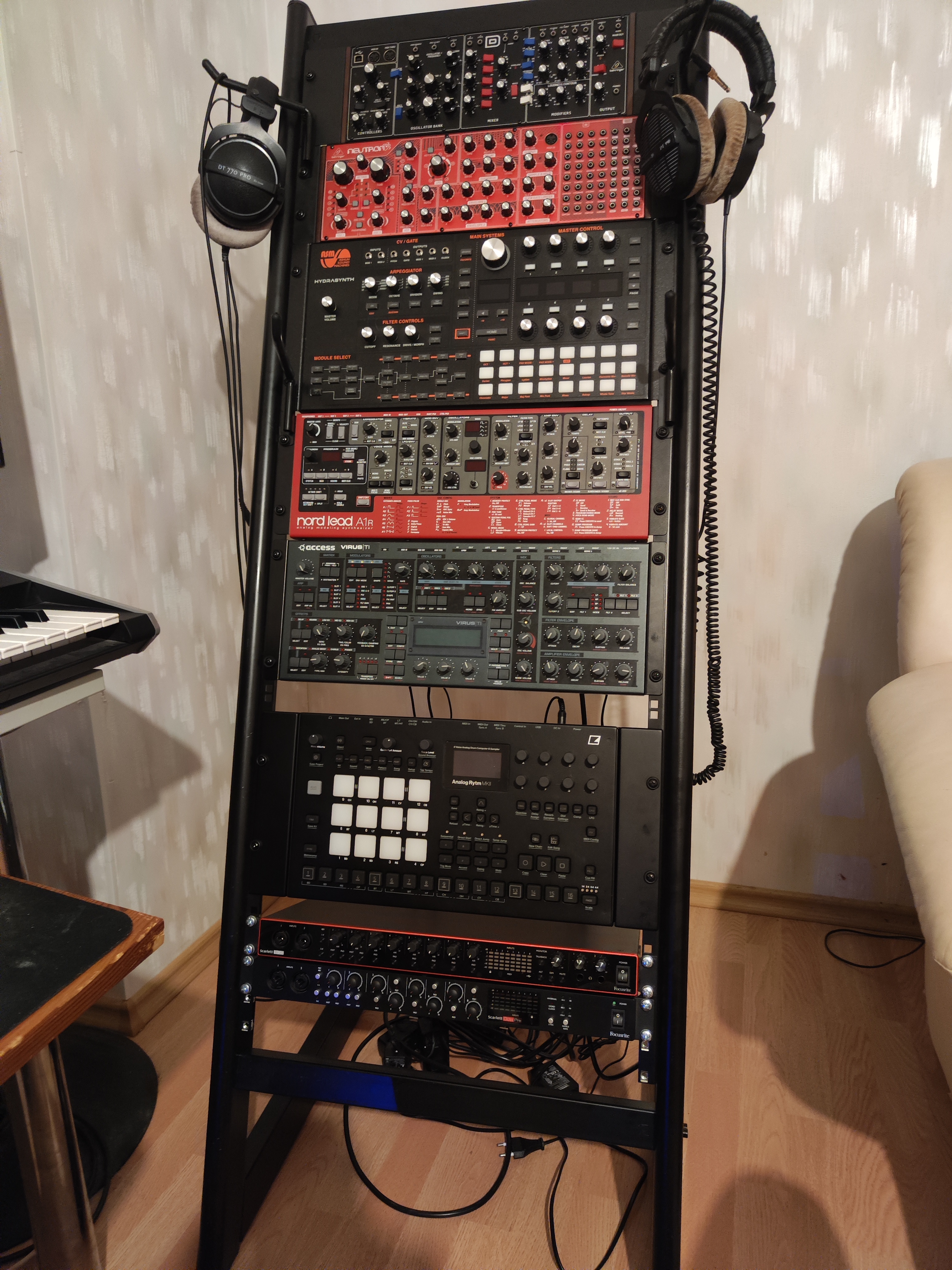 Решил дома сделать уборку и собрать все в рэк. Купил гигантский рэк высотой 152 см. Вместилось всё, кроме гитарных прибамбасов. Осталось прикупить в рэк розетки и на каждый синтезатор - кабель правильной длинны, чтобы больше не было соплей, собирающих пыль. Уже горю мыслью поменять гитарный процессор на рэковую версию и тогда больше не будет в комнате ни одного кабеля виднеться . Завтра буду думать, как установить гитары в рэк :D