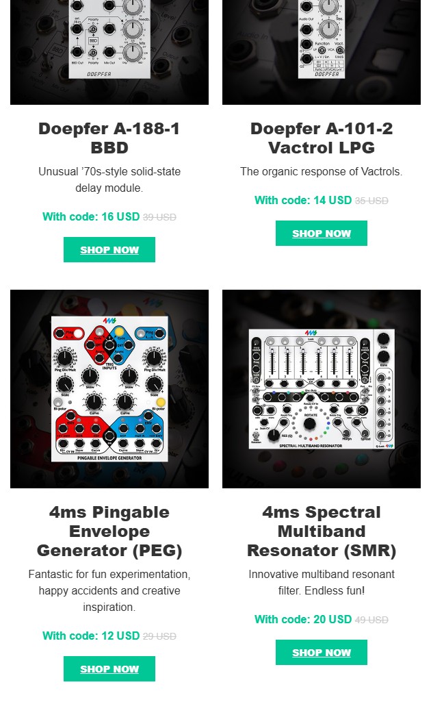 Кто подписан на Softube рассылку, получают персональный купон на неплохие скидки на модули Doepfer и 4ms (для Софтубе модуляра), меньше помоему небыло. Например 4ms PEG меньшее что помню 16$ (по плугинбутику), счас 12.