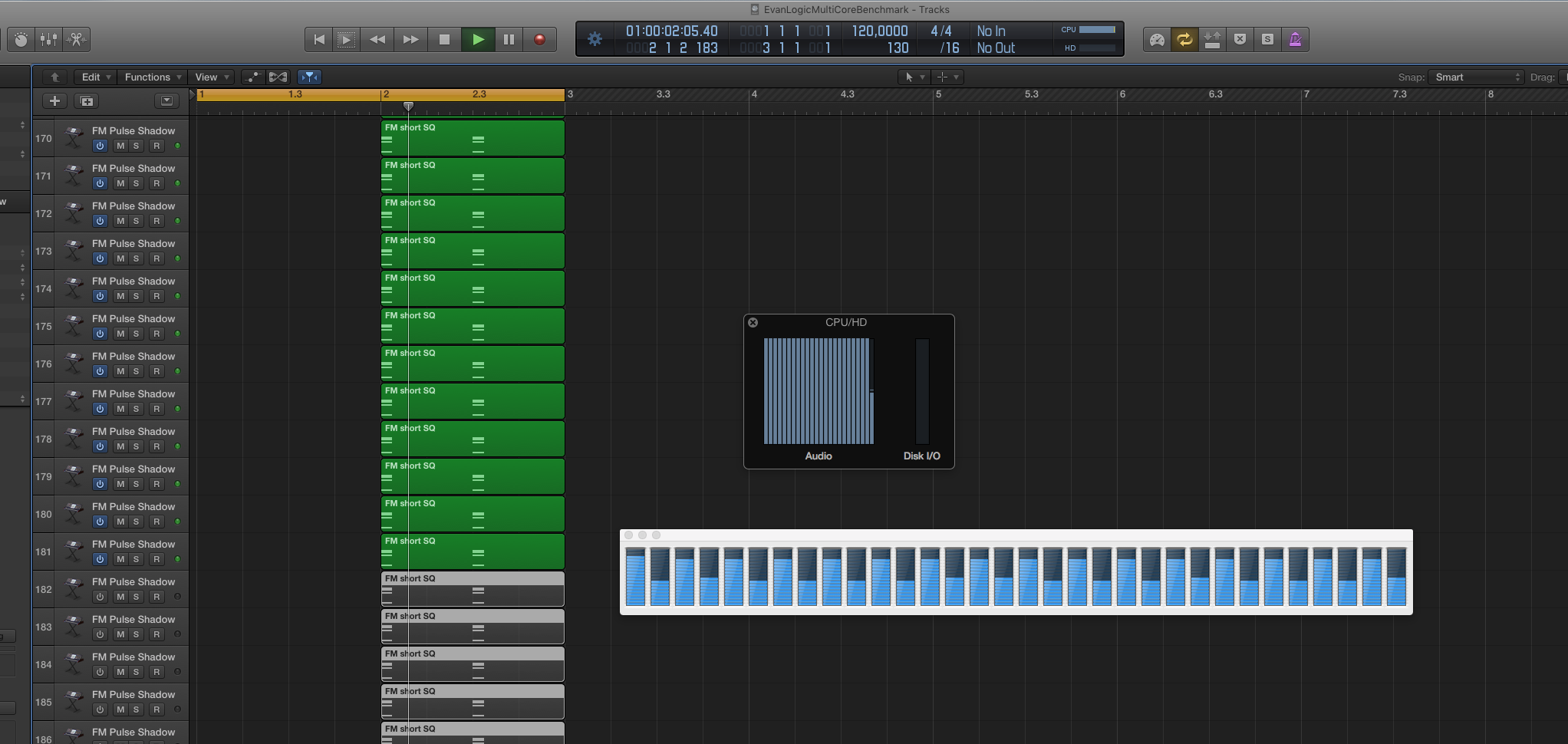 Я сейчас проверил на Мак Про Xeon X5680 3.33ghz 12 ядер, там получилось 188 треков, чуть больше чем у моего хака, но это естественно, ибо у меня в хаке нет буста, соответственно частота ЦПУ постоянно держится на 2.6ghz, с бустом была бы 3.3ghz.