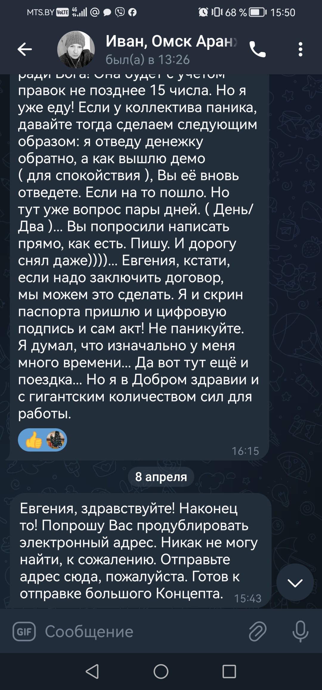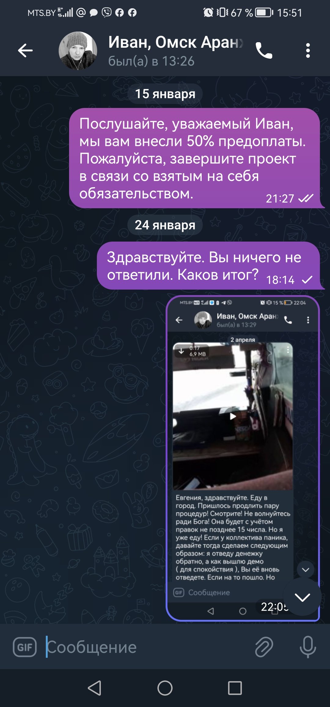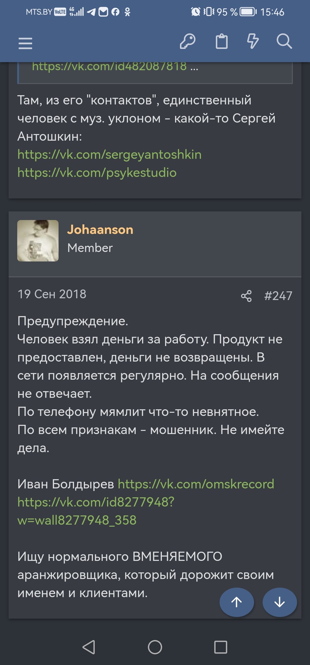 На том он и пропал. В Беларуси такой подставы нет. Обратился Яна сайте В Контакте ко мне - написал сам, предложил свои услуги (был у пары моих друзей в друзьях). Аферист. Ещё и грамотно по телефону предварительно что-то по аранжировке говорил, чувствовалось музыкальное образование. Подтверждаю ваши предыдущие сообщения давние про этого человека своими.
