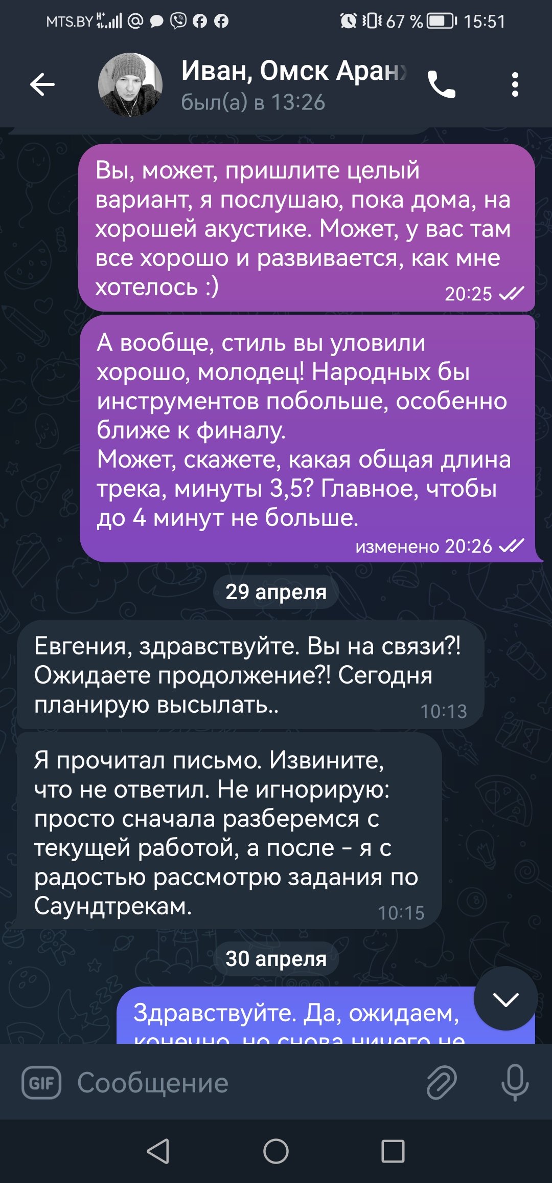 Жаль, что ранее не стала проверять. Первый раз кинул человек, взял предоплату, сбросил даже черновик (запев-припев) начатой аранжировки (которую можно за пару часов сделать. Тянул время, обещал за 1, 5 месяца. Прошло уже 10. Игнорировала Сообщение, блокировал мои звонки. Что-то потом отвечал по поводу своего запоя, обещал доделать, даже оформить официальный заказ с электронной подписью. Отказалась, сказала, что верю. А зря!