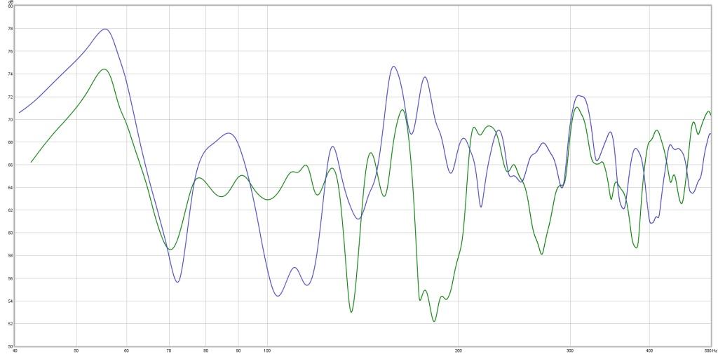 Прикрепляю график сравнения АЧХ с минимальным сглаживанием: синий - как было; зелёный - замеры с обратной стороны по расстановке 38%. Так же прикрепляю файл EQ wizard.