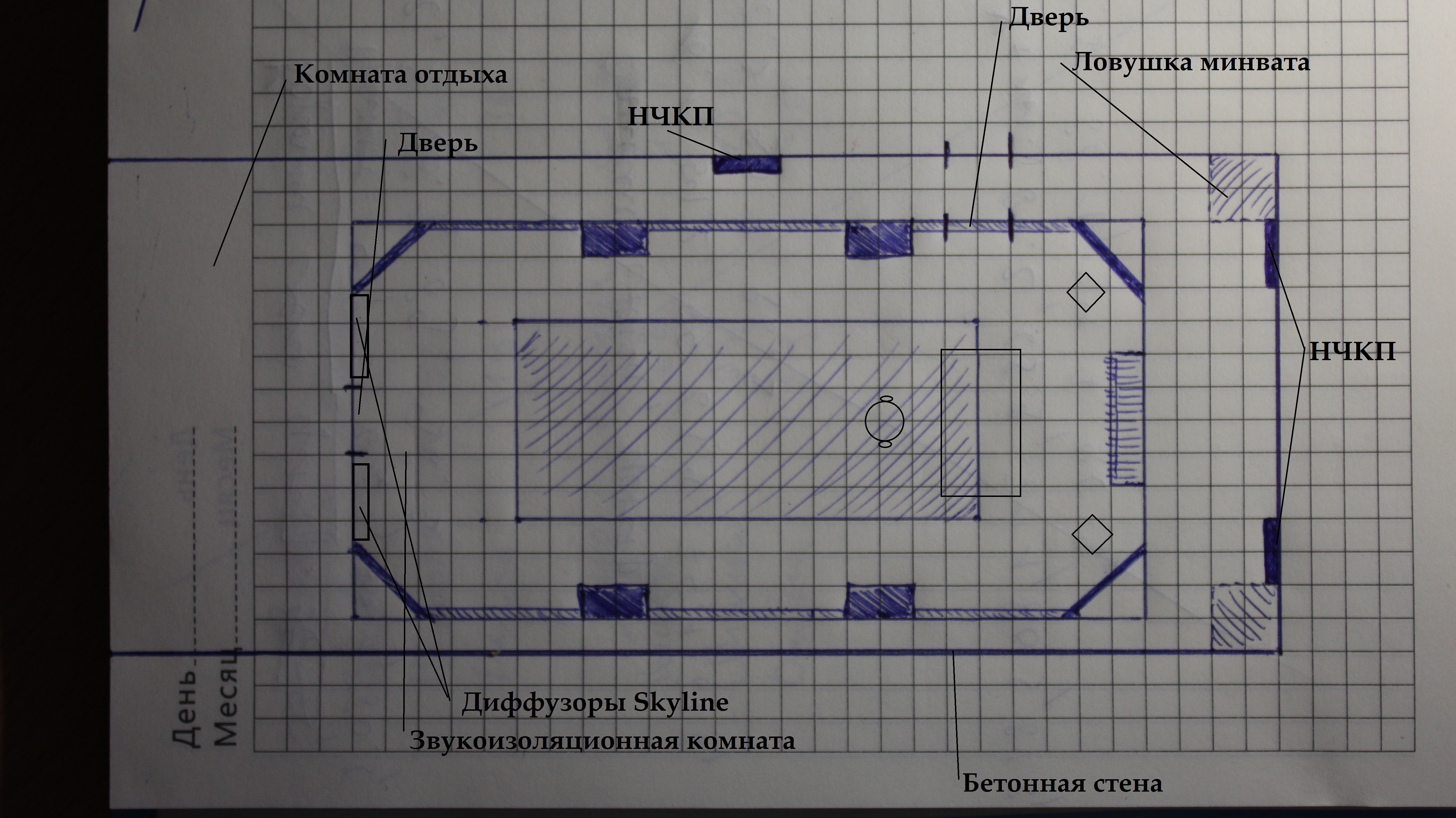 - сзади от рабочего места по среди комнаты располагается дверь в комнату отдыха, она не даст возможность повесить большой горизонтальный диффузор-рассеиватель. Но думается мне, что можно повесить по обеим сторонам от двери 2 квадратных рассеивателя (скайлайн)!? Если же сама дверь будет какие-то неприятные отражения по средним давать - можно её звукопоглотителем прикрыть!