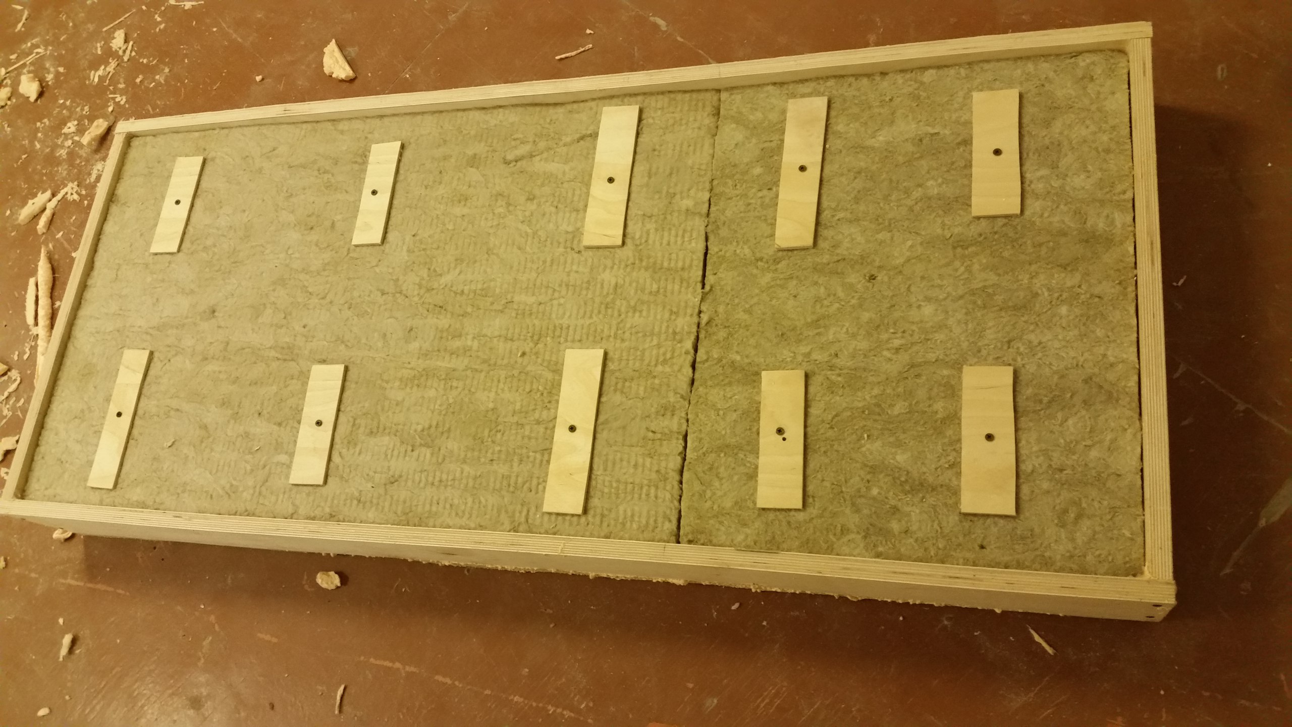 Скажу пару слов о конструкции . Я сделал сам ящик из фанеры толщиной 21 мм, и стенки и заднюю крышку. Для мембраны выбрал также фанеру толщиной 6 мм. Глубина ящика - 140 мм. На заднюю крышку я наклеил квадраты из той же фанеры, сверху положил пенопласт.