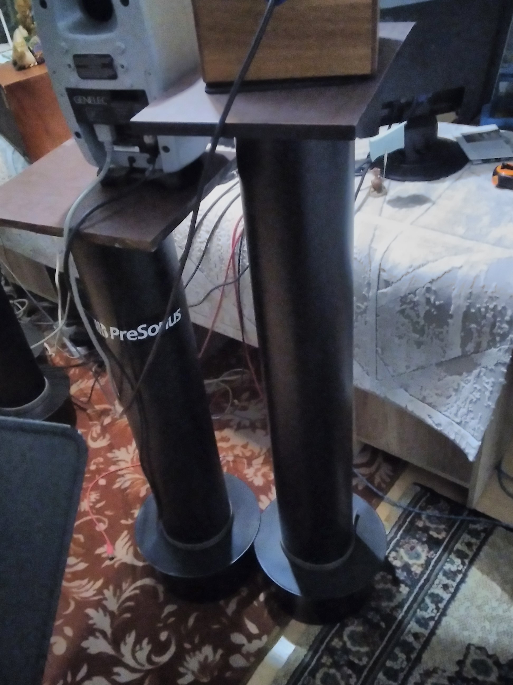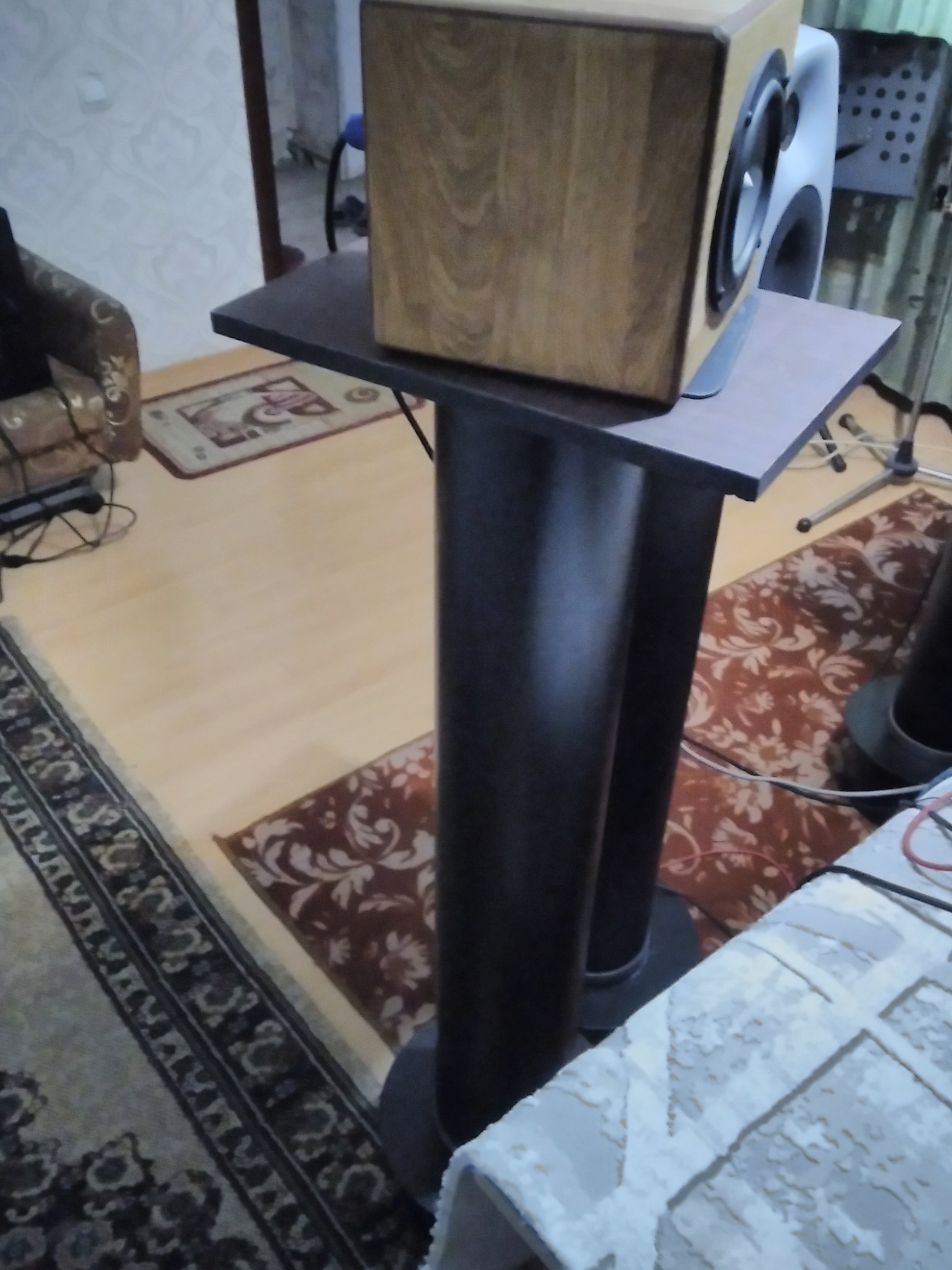 Я брал ПВХ трубу, сотку. Снизу устанавливал в основание на штукатурном растворе через 5мм резину, засыпал пескомIMG_20230714_124032.jpg. Площадка под монитор тоже развязана через резину