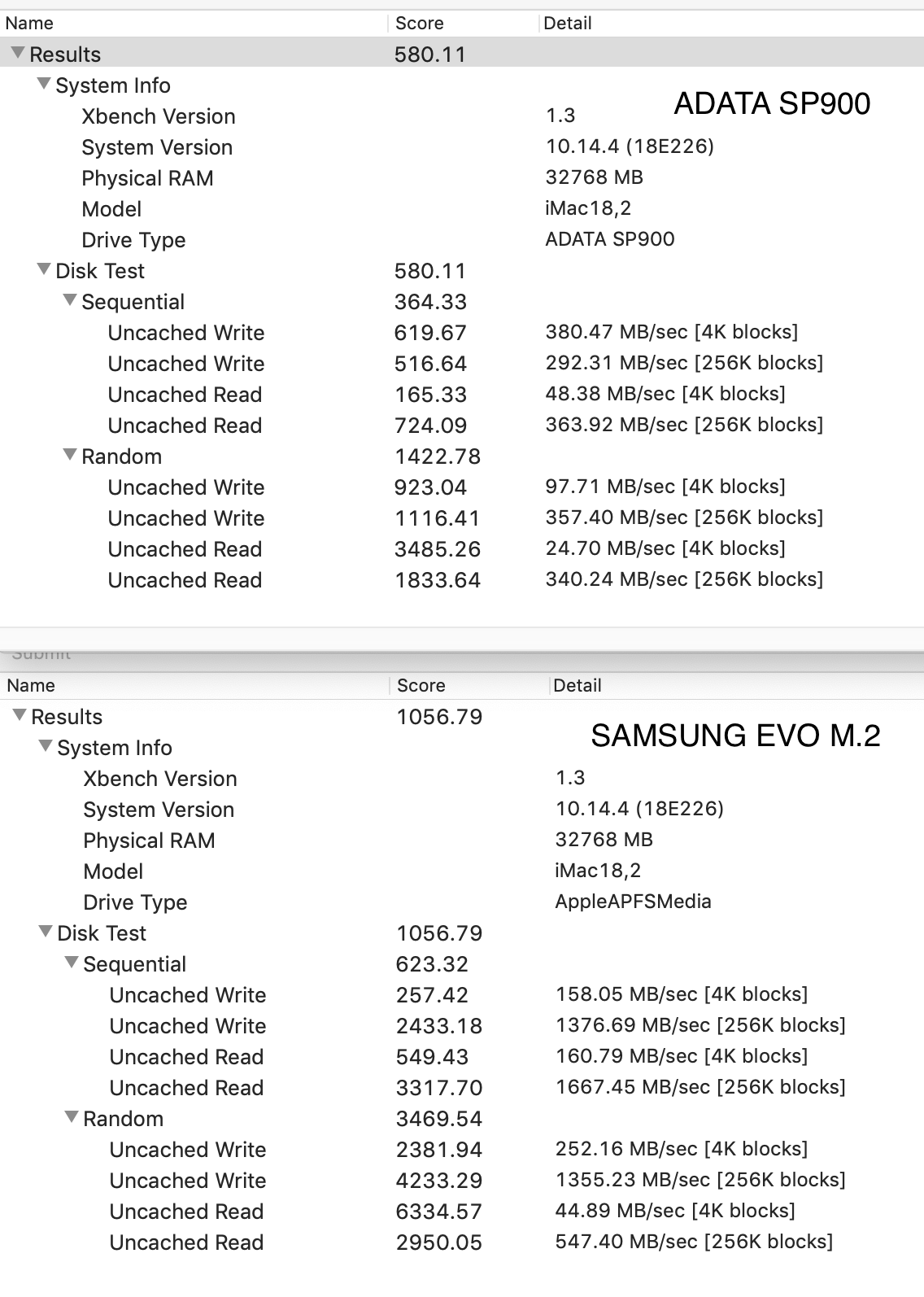 Нашел программу Xbench, в системе стоит еще ssd обычный саташный