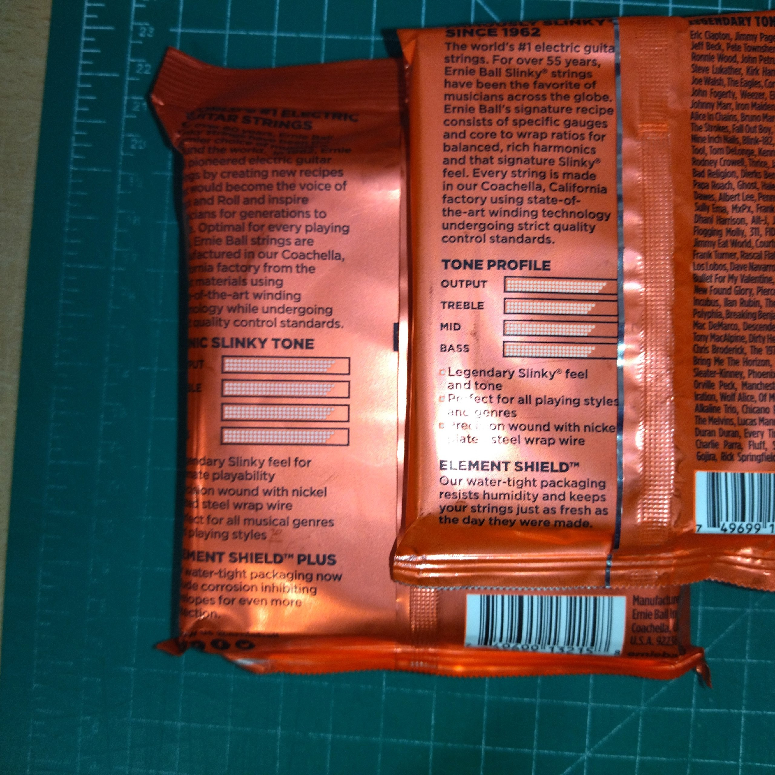 Дома лежит половина пачек из неофициальных магазинов, половина из Германии, выглядят 100% идентично, у Тиунова есть гайд, как отличить поддельные Эрни от нормальных. Можно на Струнках брать или на UsaStrings, но вообще, советую через @Artem_Konditer заказать из зарубежных магазинов, выйдет, скорее всего, сильно дешевле, если сразу много заказывать.