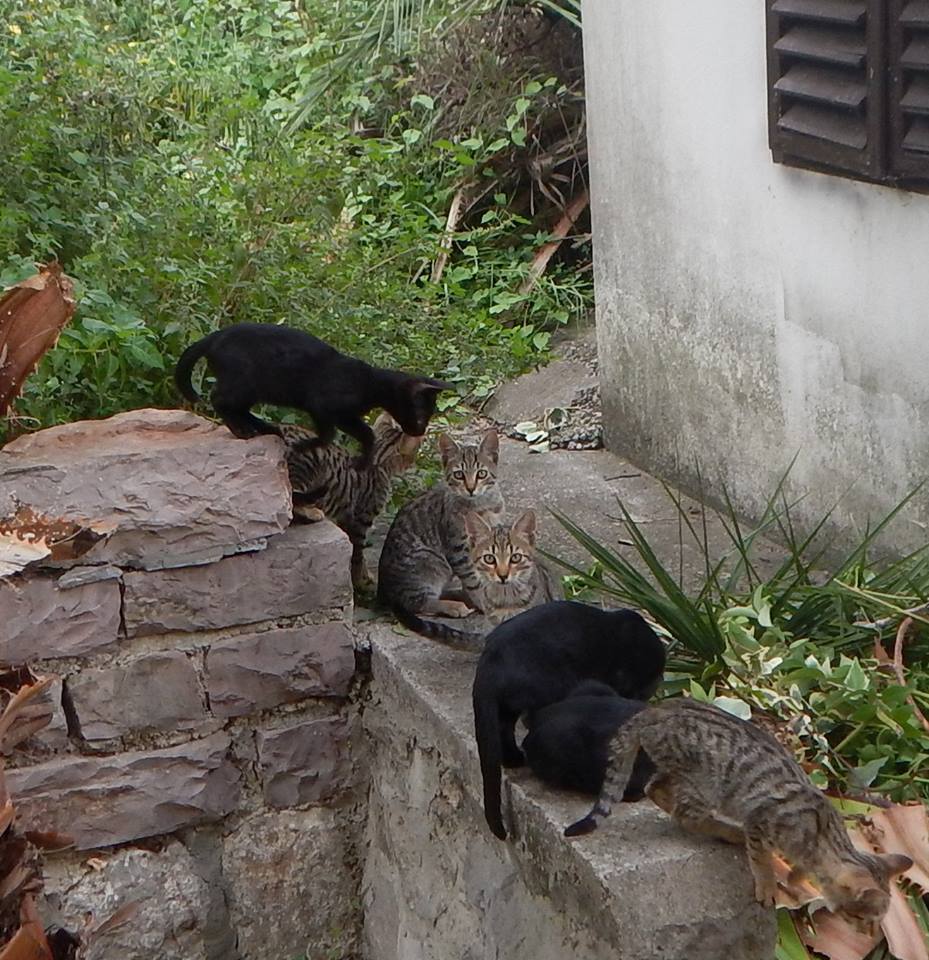 Потом о своем существовании заявили еще несколько... Ведут себя по разному - кто-то пугливо озирается, один большой (серый кабанюка) улегся как-то на стол на террасе и всем видом показывал, что он тут главный и никого не боится-). Мелкая котота проявляет любопытство и норовит пробраться в дом или заглядывает в окно. Несколько раз та самая мама-кошка спала на коврике у входной двери, прямо со всем своим выводком из семерых котят-).