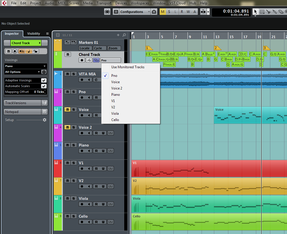 Здравствуйте! Помогите, пожалуйста! У меня Cubase le ai 10.5. Я пытаюсь создать аранжировку. Добавила аккордовый трек, прописала аккорды. Но этот трек ничего не меняет и не дает звука. В туториале на ю-тубе показано, что в области с названием трека можно выбрать инстумент, который будет воспроизводить аккорды. У них при нажатии выпадает меню, из которого они выбирают инструмент. Но у меня в этом месте при нажатии вместо меню появляется одна строчка: использовать треки с включенным монитором, и стоит галочка. Что делать? Как выбрать инструмент? Или как сделать, чтобы мои аккорды на что-то повлияли? :oops::confused::oops: