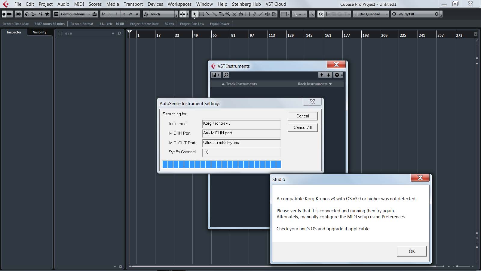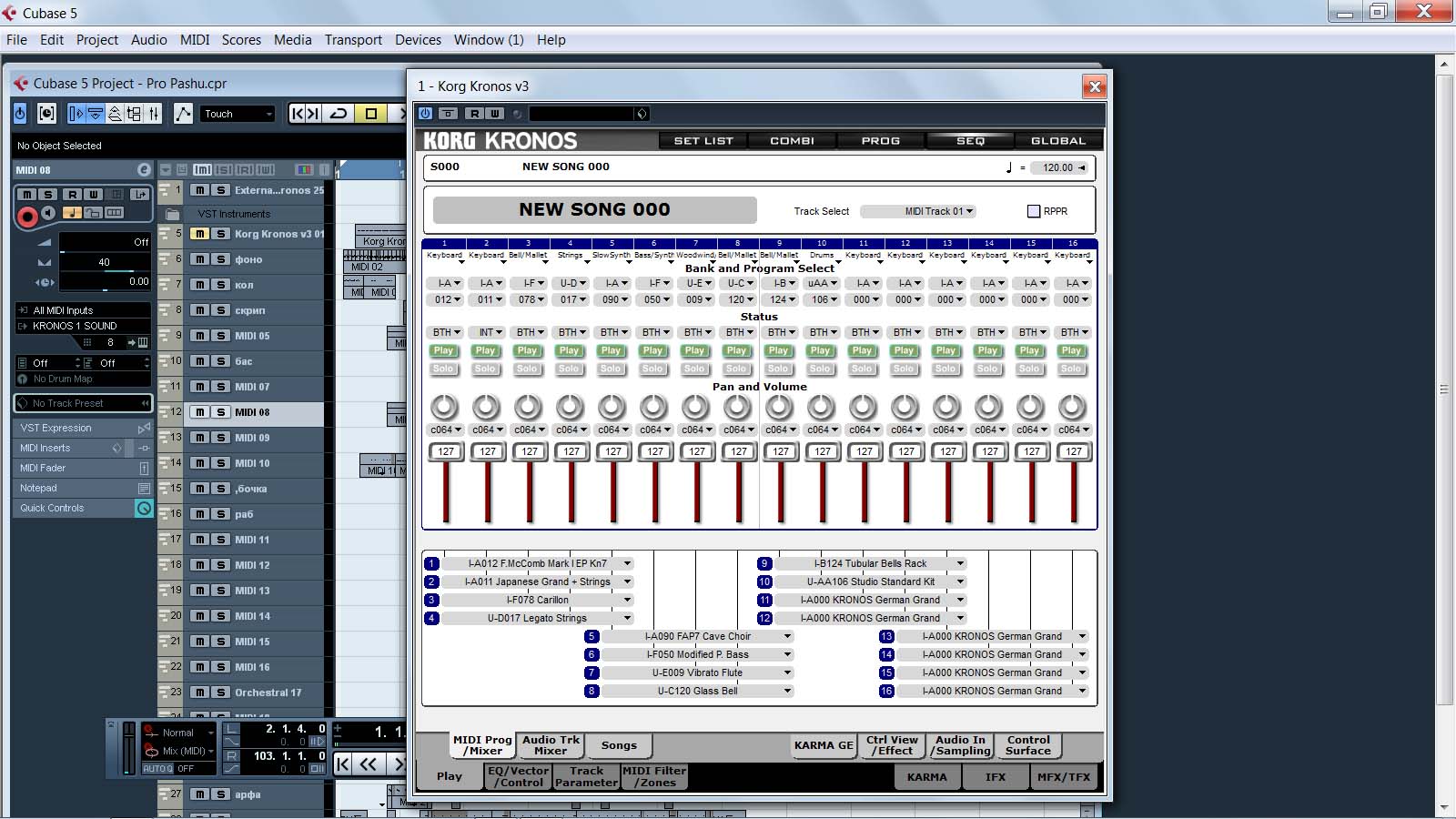 Разобрался. Установил ASIO4ALL и через VST connections в кубике нарулил. Теперь вопрос в другом: как кубик подружить с Kronos Editor? В Plug-in Manager указываю папку,где лежит файл korg kronos v3.dll, нажимаю scan, потом создаю инструмент трек, едитор запускается,но при попытке считать с Кроноса данные в миди ин едитора стоит миди порт звуковухи моей и соответственно ничего считать не удается
